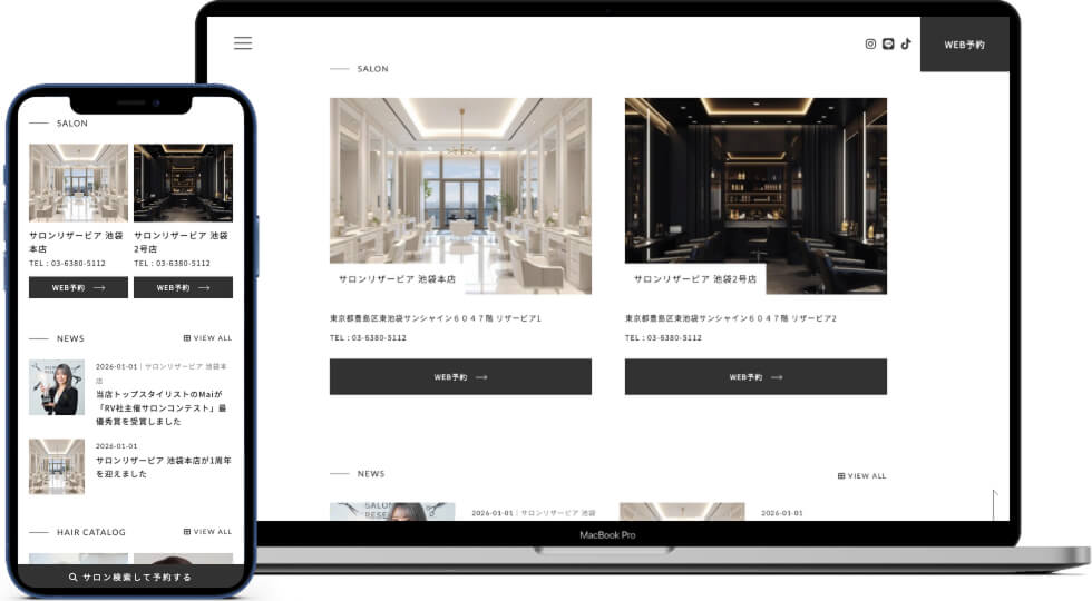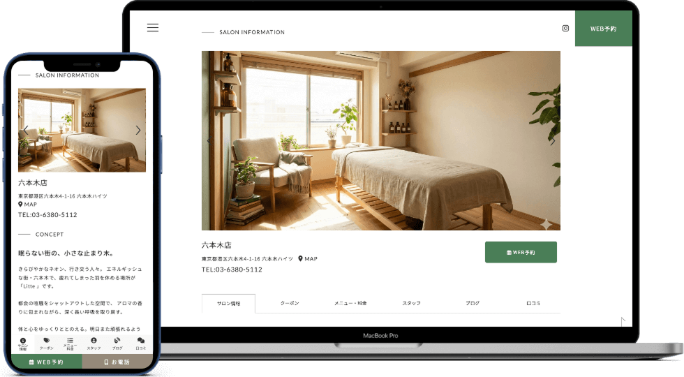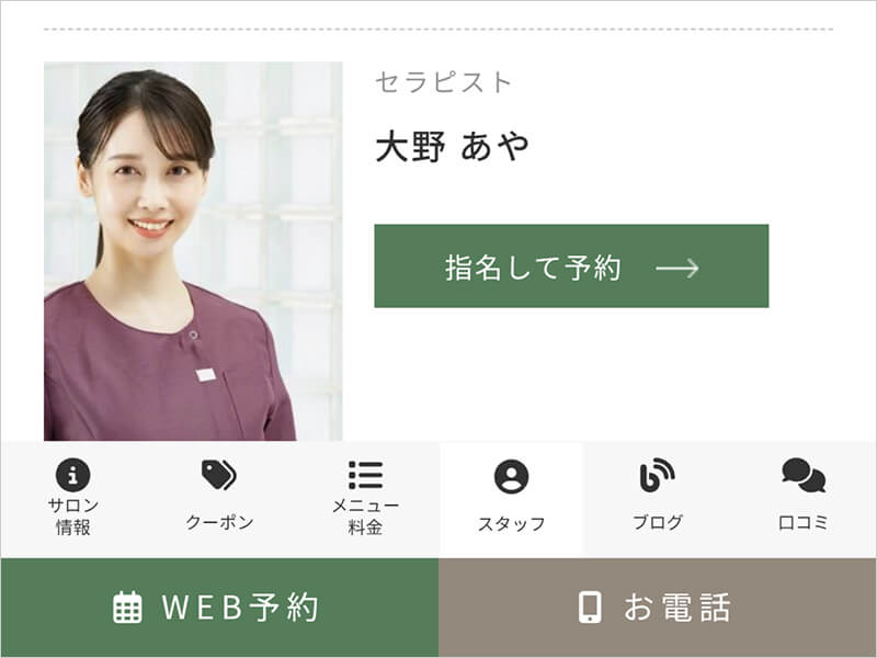 PC・スマホそれぞれ、どのページにも予約ボタンが表示されます。加えて、クーポンページではクーポンを、スタッフページではスタッフを選んだ状態で予約ページに移動できるボタンを表示できます。