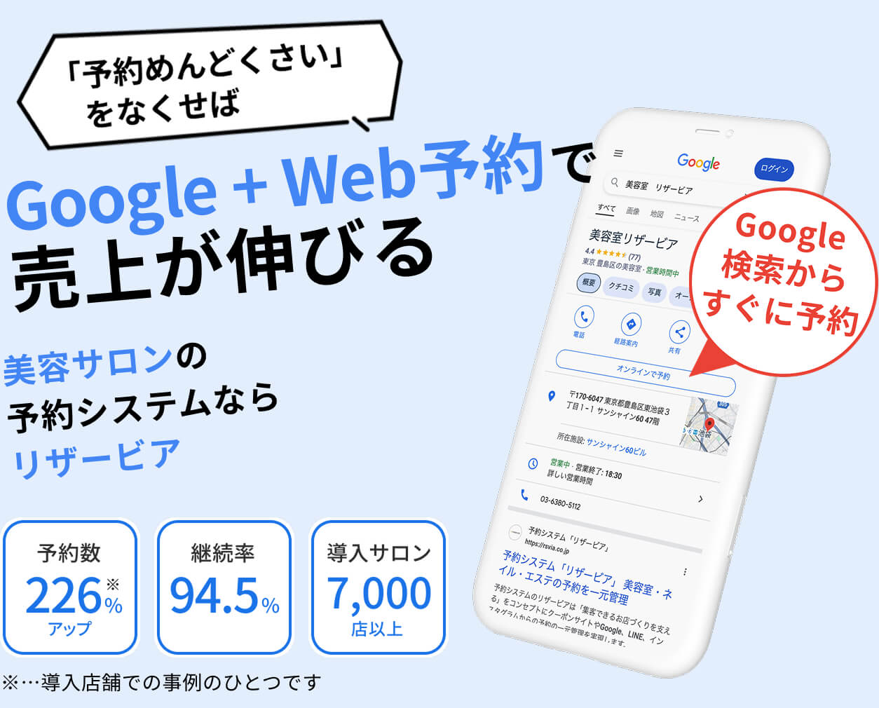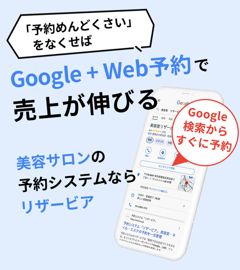 リザービア契約中の方は、Googleで予約を無料で使えます。Googleからの予約も、web予約・LINE予約と自動連携。ダブルブッキングの心配はありません。