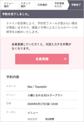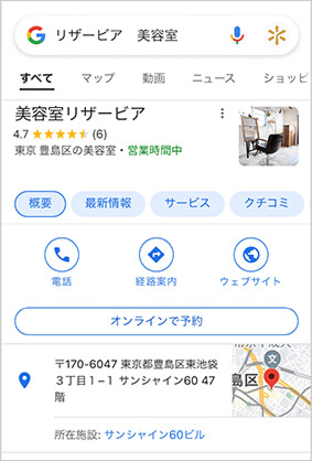 Googleで検索したあと、「オンラインで予約」ボタンからすぐに予約できます。予約途中の離脱率減少につながります。